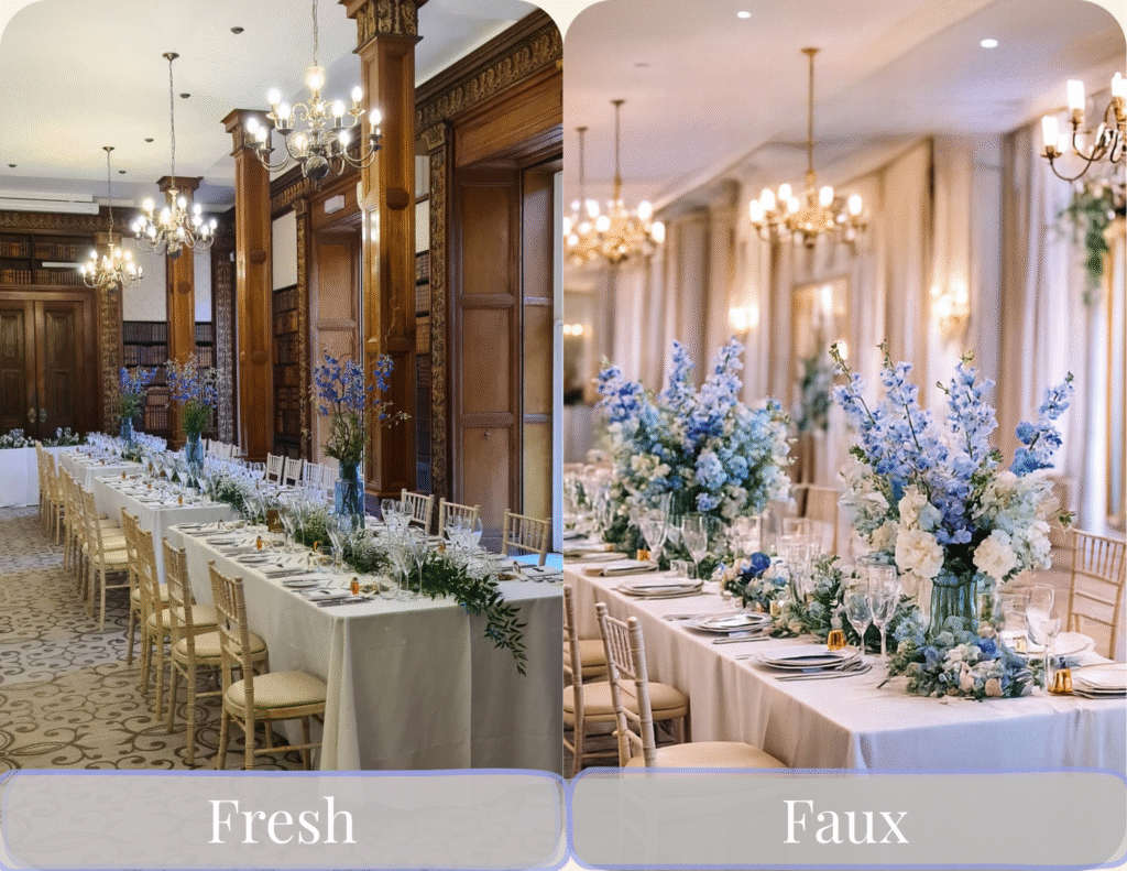 Faux florals have their place within luxury work when they solve artistic or practical challenges. They are widely used in: